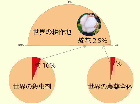 それに対して世界の殺虫剤の約16%、農薬全体の7%が綿花の畑に対して使われています。
