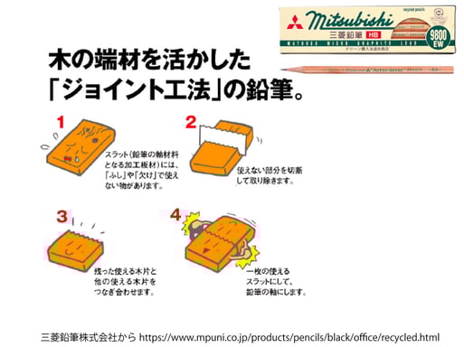 調べてみると木の端材を活かした「ジョイント工法」の鉛筆なんだって。
